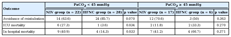 Further outcomes analyses according to the presence of hypercapnia were performed since the baseline level of PaCO2 differed significantly between the NIV and HFNC groups (Table 4). In the 50 patients with PaCO2 < 45 mmHg, patients with HFNC showed a lower ICU mortality rate (3.6% vs. 27.3%, p = 0.034) and in-hospital mortality rate (14.3% vs. 40.9%, p = 0.033), as well as a trend toward a lower incidence of reintubation than those with NIV (85.7% vs. 63.6%, p = 0.07). In the 23 patients with a PaCO2 > 45 mmHg, there were no significant differences in the above outcome variables between the two groups.