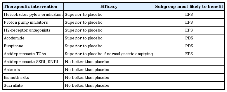 Once a firm diagnosis of FD has been established, it is clinically useful to subdivide FD into EPS or PDS when planning treatment (Table 1) [77]. All patients with FD should be reassured that FD is not associated with any increase in mortality [78]. Dietary change may help in some cases, including smaller regular meals and reduced fat intake (fat can slow gastric emptying) [32,33]. Reducing anxiety and addressing other psychological issues is often helpful, and formal psychological interventions should be considered in cases with resistant symptoms [48,79,80].