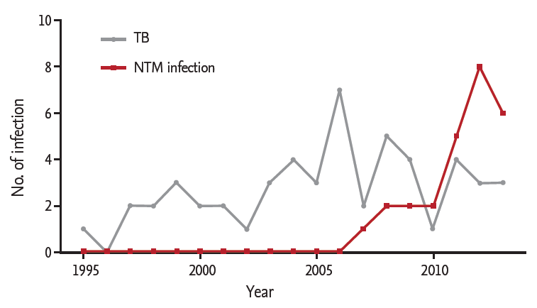 Among 1,397 RA patients, 26 cases of NTM infection and 52 cases of TB infection occurred during the follow-up period (11.1 ± 6.7 years). NTM was isolated from the clinical specimens from 111 patients, but only 26 patients (23.4%) satisfied the diagnostic criteria for NTM infection [14]. The total patient-observation duration of RA patients was 15,780 patient-years, and the incidence of NTM and TB infection after RA diagnosis was 164.8 per 100,000 patient-years and 329.5 per 100,000 patient-years, respectively. NTM infections were increased annually, whereas TB infection has developed in a relatively steady pattern (Fig. 1).