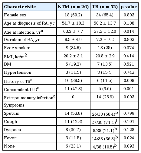 In our current study, we describe the incidence and clinical characteristics of NTM infection in RA patients by comparison with TB infection, which is endemic in South Korea.