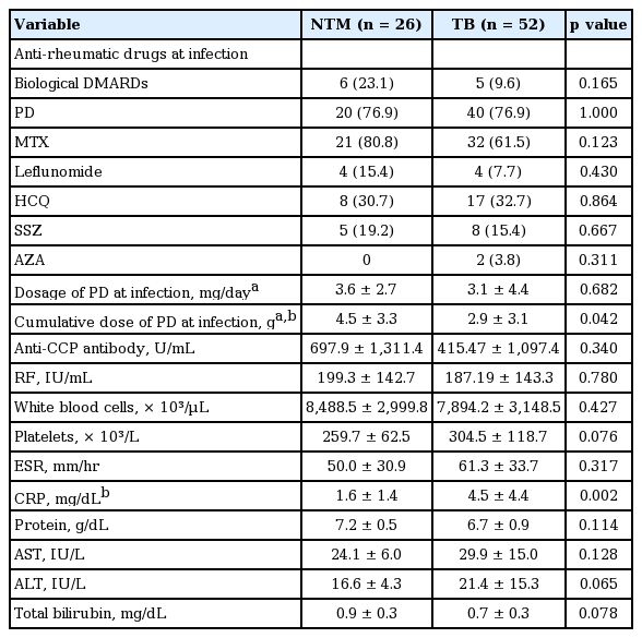 Among the 26 patients in our current series with NTM infection, six (23.1%) were treated with biological disease modifying anti-rheumatic drugs (DMARDs) at the time of diagnosis (etanercept [n = 4], infliximab [n = 2]). For TB patients, five cases (9.6%) were treated with biological DMARDs (abatacept [n = 3], etanercept [n = 1], infliximab [n = 1]) (Table 2). The cumulative steroid dose at the time of diagnosis was 4.5 ± 3.3 g (equivalent dose with prednisolone) in the NTM group, which is higher than the TB patients. However, there was no difference in daily steroid dosage between the two groups at the time of diagnosis. There were no differences in the levels of anti-cyclic citrullinated antibody, rheumatoid factor, white blood cell count, platelet count, erythrocyte sedimentation rate (ESR), protein, alanine transaminase, aspartate transaminase, or total bilirubin between the two groups, with the exception of hemoglobin and C-reactive protein (CRP).