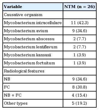 The most common species of NTM infection in RA patients was the Mycobacterium avium complex (MAC) (76.5%; Mycobacterium intracellulare [n = 11], M. avium [n = 9]), followed by Mycobacterium abscessus (n = 2) and Mycobacterium lentiflavum (n = 2) (Table 3). Radiologic features indicated NB type in nine patients (34.6%), FC type in eight patients (30.8%), NB + FC type in four patients (15.4%), and other types in five patients (19.2%).