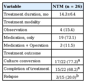 As shown in Table 4, the average treatment duration for NTM infection was 14.3 ± 6.4 months. Nineteen patients (73.1%) were treated with macrolide-based medications only, while additional lobectomy with medication was conducted in three patients (11.5%). Four patients (15.4%) were observed without treatment due to old age (n = 2) or refusal of treatment (n = 2). Among the 22 patients treated, 17 patients (77.3%) achieved a negative conversion of sputum culture, either with completion of treatment (n = 15) or on anti-NTM medication at last follow-up visit (n = 2). Five patients (22.7%) did not obtain negative culture conversion with maintenance of treatment (n = 2), treatment withdrawal due to adverse effects (n = 2), and death from pneumonia after lobectomy (n = 1). Pneumonia was the cause of death in one of the four patients not treated after 2 months of NTM infection. Among 15 patients who completed treatment, three experienced a relapse.