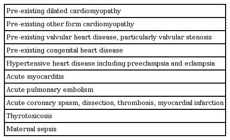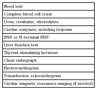 Diagnosis is often delayed because symptoms of PPCM are not specific, particularly in late pregnancy. PPCM should be considered in all peripartum women with signs and symptoms of HF or those with delayed recovery to a pre-pregnant state (Fig. 1). Complete family history should be obtained to identify familial patterns of cardiomyopathy. Chest X-ray can show cardiomegaly, pulmonary congestion, and pleural effusion. While electrocardiogram is not specific for PPCM, several findings including non-specific ST-T wave abnormality, QT interval prolongation, QRS widening, LV hypertrophy, and atrial fibrillation, may indicate this pathologic process and urge cardiac evaluation. The following laboratory tests are necessary, although they are not specific for PPCM: complete blood cell count, blood urea, creatinine, electrolytes, liver function test, thyroid stimulating hormone, cardiac troponin, and brain-type natriuretic peptide (BNP) (Table 1). Recent experimental studies suggest some biomarkers might be specific for PPCM; the 16-kDa prolactin, microRNA-146a, and soluble fms-like tyrosine kinase-1 have been proposed, although their diagnostic value in clinical practice needs verification [13,14,18]. Endomyocardial biopsy is warranted in some cases to exclude the inflammatory etiology of acute HF.