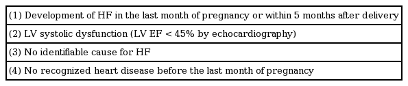 In 2010, the Working Group on PPCM of the European Society of Cardiology defined PPCM as, ‘an idiopathic cardiomyopathy presenting with heart failure (HF) secondary to left ventricular (LV) systolic dysfunction towards the end of pregnancy or in the months following delivery, where no other cause of HF is found.’ It is a diagnosis of exclusion. While the LV may not be dilated, the ejection fraction (EF) is nearly always reduced below 45% [2].