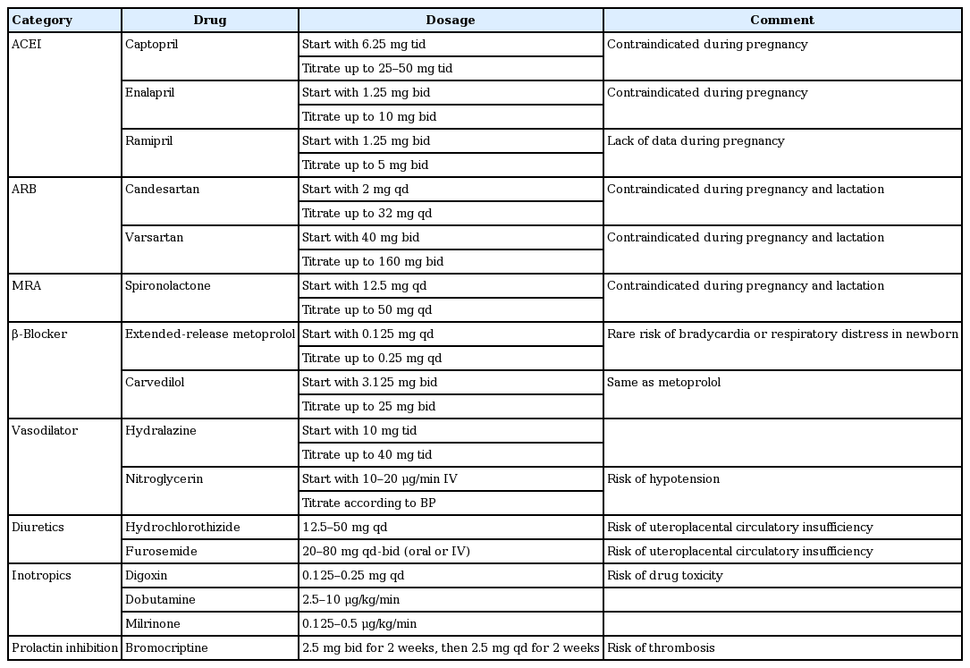 The goal of management is to improve hemodynamic status, minimize symptoms, and obtain the best fetal outcome [2]. General recommendations include a low sodium diet, fluid restriction, and light activity. When the patient is stable, oral HF medication is the mainstay of treatment (Table 4). Special attention is required to ensure fetal safety and to monitor drug excretion during breastfeeding.