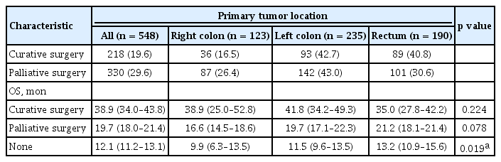 Surgical resection of the primary and metastatic tumors was associated with a prolonged survival. Curative resections were performed in 218 patients (19.6%). One hundred and thirty-eight patients (12.4%) underwent surgical resection as the initial treatment and 80 patients (7.2%) underwent surgical resection during first- or second-line chemotherapy. Curative resections were usually performed by resecting the primary tumor and metastatic tumors with or without radiofrequency ablation. Palliative resections were performed in 330 patients (29.6%). The majority of palliative resections were primary tumor resections (Table 8). Irrespective of whether the surgical resections were curative, tumor resection was associated with a more favorable prognosis. The median OS was 38.9 months (95% CI, 34.0 to 43.8) for patients who had undergone curative resection, 19.7 months (95% CI, 18.0 to 21.4) for patients who had undergone palliative resection, and 12.1 months (95% CI, 11.2 to 13.1) for patients who did not undergo surgical resection (p = 0.007). However, in patients who underwent curative or palliative resection, no significant differences in OS were observed with respect to primary tumor location (p = 0.224 and p = 0.078, respectively).