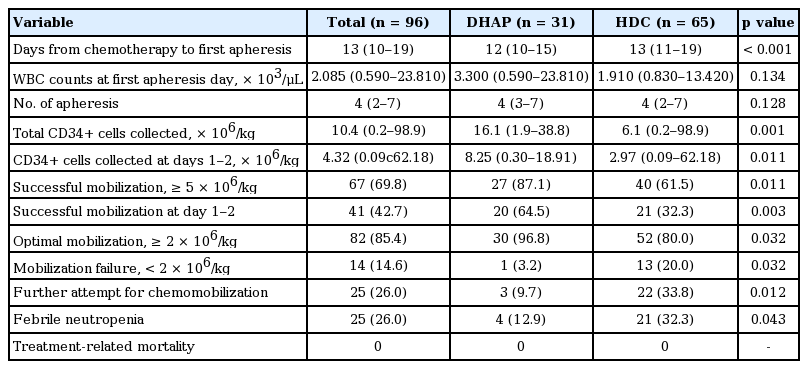High-dose chemotherapy with autologous stem cell transplantation (ASCT) remains an important treatment option for patients with non-Hodgkin’s lymphoma (NHL) [1-3]. For successful ASCT, it is an essential first step to collect a sufficient amount of mobilized peripheral blood stem cells (PBSCs) [4]. However, inadequate PBSC mobilization may lead to treatment delay, potentially rendering some patients ineligible for planned ASCT [5,6]. In general, mobilization using chemotherapy combined with regular granulocyte-colony stimulating factor (G-CSF) stimulation is known to be associated with a higher mobilizing efficacy compared to G-CSF alone at some addition of costs and toxicities [7-10]. One of the common chemotherapeutic regimens for PBSC mobilization includes high-dose cyclophosphamide (HDC), with well-established efficacy of mobilization in various diseases and situations [7-13]. In addition, the dexamethasone, cytarabine, and cisplatin (DHAP) regimen has also been commonly used for chemomobilization of patients with lymphoma, and it was shown to be effective for PBSC mobilization [13-15]. However, these studies included a substantial number of lymphoma patients with relapsed or primary refractory diseases, who were previously exposed to various chemotherapy regimens [10]. These characteristics may greatly influence the comparison of the mobilizing efficacies of these chemotherapy regimens. Therefore, it is necessary to compare the mobilizing efficacy of these chemotherapy regimens in patients who are responsive to cyclophosphamide, doxorubicin, vincristine, and prednisone (CHOP) or rituximab-CHOP (R-CHOP) chemotherapy and candidates for up-front ASCT. However, until now, no specific data comparing the mobilizing efficacy and safety of the DHAP regimen with that of HDC as a chemomobilizer has been reported in this group of patients.