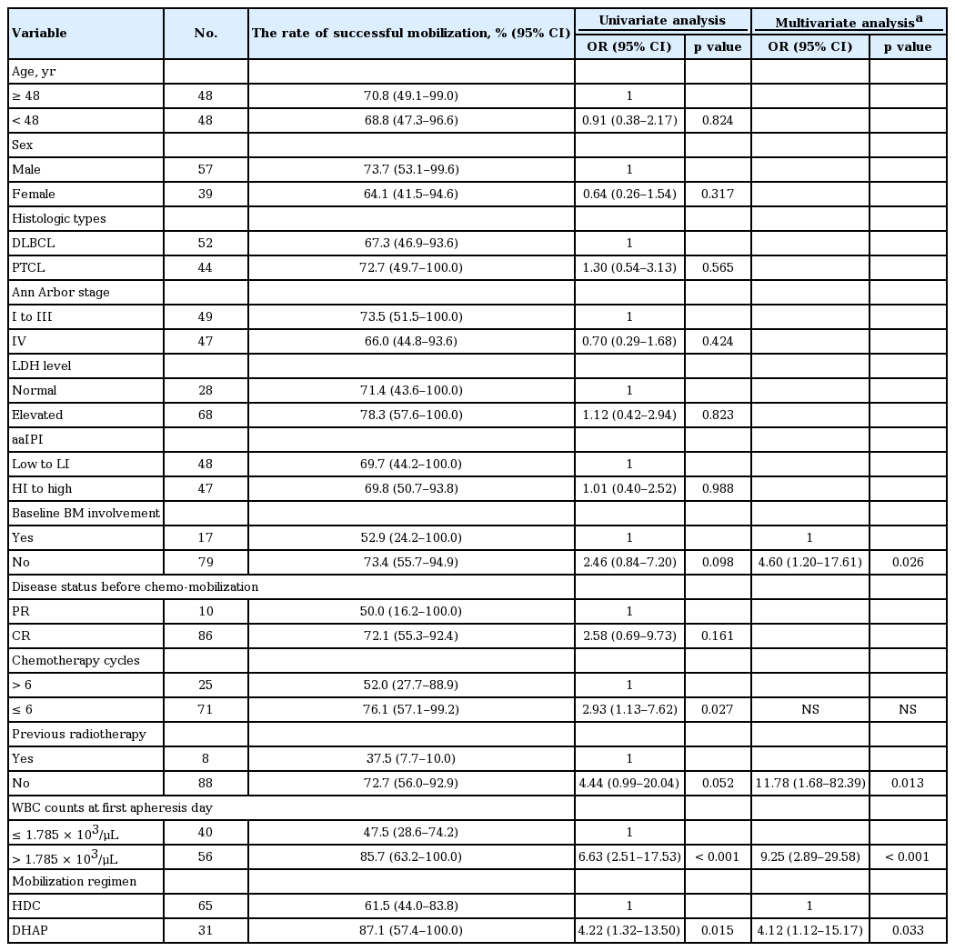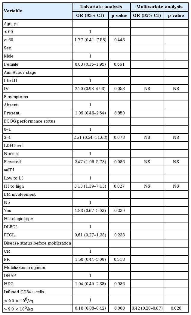 In the univariate analysis, chemotherapy cycles administered ≤ 6 cycles, WBC counts at first apheresis day > 1.785 × 103/μL, and DHAP regimen were significant factors for successful mobilization (Table 3). No baseline BM involvement and no previous radiotherapy showed marginally significant trends for successful mobilization (Table 3). However, based on the multivariate analysis that included all these factors, no baseline BM involvement (OR, 4.60; 95% CI, 1.20 to 17.61), no previous radiotherapy (OR, 11.78; 95% CI, 1.68 to 82.39), WBC counts at first apheresis day > 1.785 × 103/μL (OR, 9.25; 95% CI, 2.89 to 29.58), and the DHAP regimen (OR, 4.12; 95% CI, 1.12 to 15.17) were independent predictors for successful mobilization (Table 3).