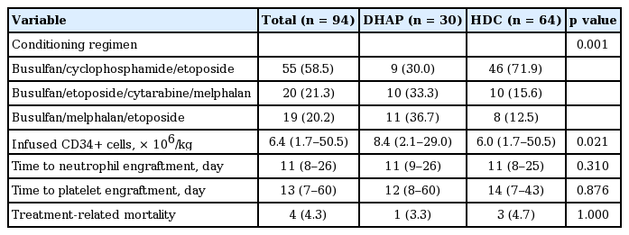 Of the 96 patients underwent PBSC mobilization and collection, two patients did not proceed to up-front ASCT because of failed mobilization in one patient (HDC group) and patient’s refusal in one (DHAP group). All 94 patients underwent up-front ASCT received busulfan-based conditioning chemotherapy (Table 4). Although higher number of CD34+ cells were infused in the DHAP group compared to the HDC group (8.4 × 106/kg vs. 6.0 × 106/kg, p = 0.021) during ASCT procedures, time to neutrophil engraftment (median, 11 days vs. 11 days, p = 0.310) and platelet engraftment (median, 12 days vs. 14 days, p = 0.876) were not different according to chemomobilization regimen (Table 4).