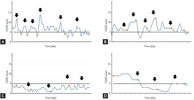 Disparity in activity was defined when the CDSD score at home was higher than the score recorded at the next routine outpatient clinic according to a cut-off value of 5 (5 ≥ at home and 5 < at outpatient clinic) (Fig. 1A). When patients showed disparity more than 30% of whole activity record, they were assigned as a disparity group. Concordance in activity was defined when the CDSD score at home was in the same category as that recorded at the next routine outpatient clinic, again with a cut-off value of 5. Based on this definition, concordance group was categorised into following three groups: (1) concordance high (CH): both activities at home and the next outpatient clinic were greater than a CDSD score of 5 (Fig. 1B); (2) concordance low (CL): both activities at home and the next outpatient clinic were equal to or less than a CDSD score of 5 (Fig. 1C); and (3) concordance both (CB): both cycles (1 and 2) appeared during the entire observation (Fig. 1D). Three authors (E.S.K., B.I.J., and S.W.J.) from each hospital discussed and decided the main pattern of graph for each patient.