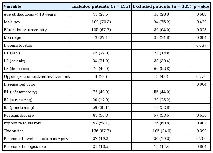 Several limitations of the study should be noted. First, a large number of patients (37.8%) were excluded after enrolment in the study due to a lack of sustained participation for at least 3 months. The high attrition rate (up to 60%), or low compliance is one of the obstacles faced by studies that use telemedicine in IBD [16,17]. We believe that this low compliance might be partly attributed to some difficulty to use telemonitoring system. Therefore, it is needed to simplify and make the system user-friendly. However, when we compared the baseline characteristics of the included patients who recorded more than consecutive 3 months with the patients who were excluded, there were no significant differences except for disease location. There were more L1-type patients (ileal location) among those who recorded their activity for more than 3 months than in those who did not (29% vs. 16.8%, p = 0.037) (Table 3). Although the exact cause for this difference is unclear, patients with L1 may be more likely to pay attention to their symptoms because the ileal location is known to be associated with poor disease course [18,19]. This aspect should be taken into account when conducting studies on PRO using telemedicine in patients with CD. Second, patients in remission may be less likely to complete the home diary entries; thereby, might have been excluded from the study. Third, patients in this study may have had a more serious disease course because this study was conducted in tertiary referral hospitals. Thus, care should be taken in the generalisation of these findings. Finally, we could not find the relationship of disease activity patterns with the risk of bowel resection surgery, one of the wellknown disabled outcomes of CD. This might be attributed to the small sample size and relatively short follow-up period to have enough cases of surgery in this study.