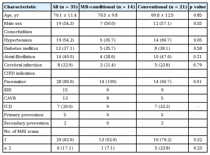 For the analyses, 14 and 21 patients were classified into the MR-conditional and conventional groups, respectively. Among the 21 patients in the conventional group, 11, one, and nine patients had only MR-conditional leads, only MR-conditional generators, and both conventional leads and generators, respectively.
