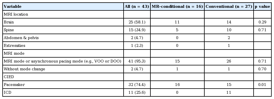 Among the 43 MRI scans, 16 (37.2%) and 27 (62.8%) scans were performed in the MR-conditional and conventional groups, respectively. Twenty-five (58.1%), 15 (34.9%), two (4.7%), and one (2.3%) of the 43 MRI scans were performed for imaging of the head, spine, abdomen or pelvis, and lower extremities, respectively. All MRIs were performed using a 1.5-T magnet (Table 2).