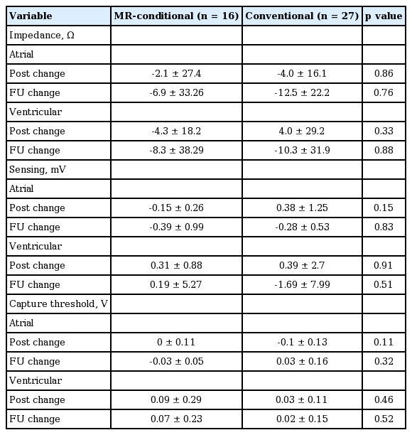 The changes between pre- and post-MRI and between pre-MRI and the follow-up in the impedance, sensing, and captured threshold were analyzed in the MR-conditional and conventional groups (Table 3). There were no significant differences between the two groups in the changes in atrial and ventricular lead impedance, sensing, and capture threshold, despite the mean atrial threshold of the conventional group being higher than that in the MR-conditional group at the follow-up.