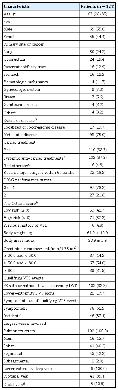 Baseline clinical and thrombotic event characteristics of the 124 patients are described in Table 1. Of these, 88.7% of patients had solid cancers, 75.0% had metastatic disease, and 88.7% were receiving chemotherapy or radiotherapy. The most common primary tumor sites were lung, colorectum, pancreaticobiliary tract, and stomach. The qualifying VTE event was PE ± DVT in 82.3% of the patients and presented as symptomatic in 62.9% of the patients.