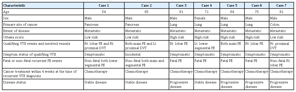 The present prospective, multicenter, open-label study was designed to investigate the effectiveness and safety of oral rivaroxaban treatment in consecutive patients with active cancer and objectively diagnosed lower-extremity DVT, PE, or both, who had a life expectancy of ≥ 3 months. The study was conducted in nine institutions of the Thrombosis Working Party of the Korean Society of Hematology and Venous Thrombosis Division of the Korean Society of Thrombosis and Hemostasis. Active cancer was defined as a histologically confirmed solid cancer or hematologic malignancy (except for basal cell or squamous cell carcinoma of the skin), which were diagnosed or treated within the previous 6 months, or as a recurrent/metastatic cancer. PE was diagnosed based on the presence of non-enhancing filling defects in at least one subsegmental pulmonary artery on computed tomography (CT) pulmonary angiography, or high probability mismatched perfusion defect on ventilation/perfusion lung scan. DVT was diagnosed based on the non-compressibility on ultrasonography, or intraluminal filling defects in lower-extremity deep vein on CT venography. Incidental PE, which was defined when PE was detected by imaging studies that were performed for reasons other than suspected PE, was considered if the equivalent diagnostic criteria for symptomatic PE were met.