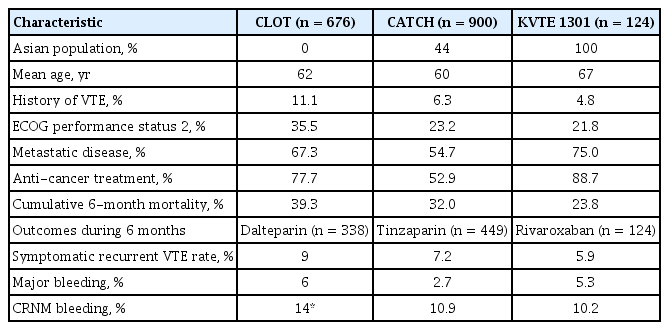 Comparison of baseline characteristics, recurrent VTE, and bleeding events in the KVTE 1301 study with CLOT and CATCH trials