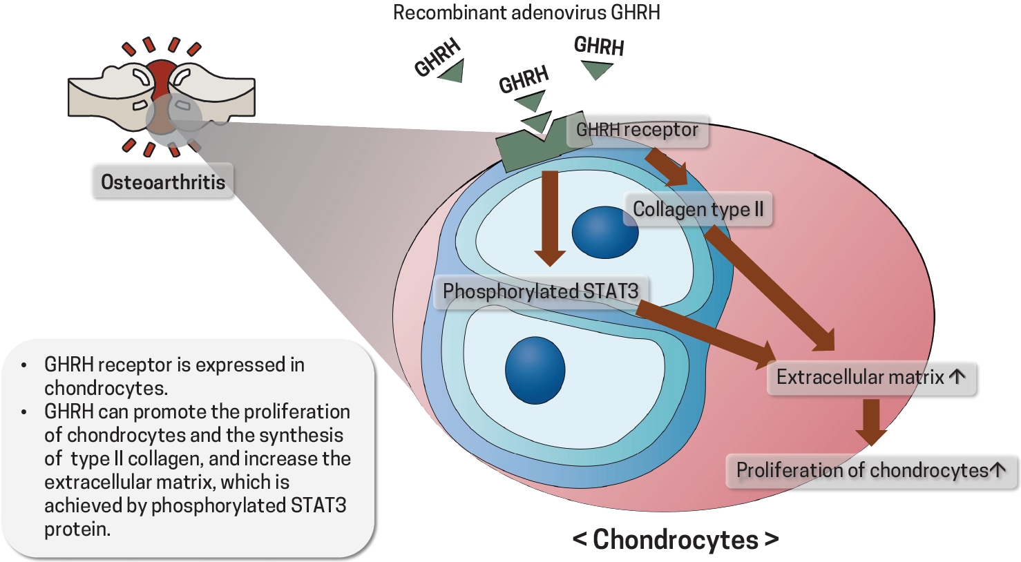 Our results show that the GHRH receptor is expressed in chondrocytes. GHRH can promote the proliferation of chondrocytes and the synthesis of type II collagen, and increase the extracellular matrix, which is achieved by phosphorylated STAT3 protein.