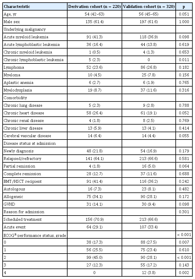 The survival of patients with hematological malignancies has recently improved because of advances in chemotherapy protocols and transplantation conditioning regimens [1,2]. Aggressive treatment and improved general care has also led to an increased demand for intensive care among hospitalized patients with hematological malignancies [1]. Favorable outcomes may be associated with an appropriate timing of transfer to the intensive care unit (ICU) [3], and previous studies have suggested that up to 50% of cardiopulmonary arrests in the general ward could be prevented by earlier treatment and transfer to the ICU [4]. Azoulay et al. [5] reported that earlier ICU admission was associated with improved survival in critically ill patients with hematologic malignancies. However, resource limitations in ICUs can lead to patients staying longer in the general ward and receiving inadequate treatment [6]. Thus, delayed ICU admission can lead to physiological deterioration, prolonged hospitalization, high costs, and poor outcomes [3,6,7].