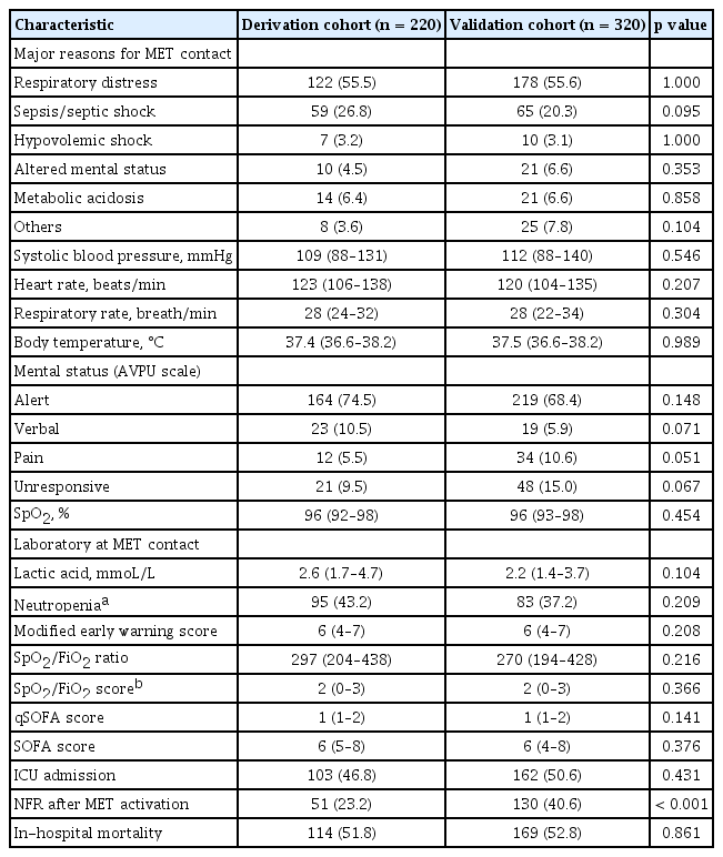 A total of 2,832 deteriorating ward patients had MET contact during the derivation period, and 243 patients with hematologic malignancies were included. Eighteen patients who received NFR after MET contact, and 5 patients who were MET-activated by CPR were excluded. Finally, 220 patients were enrolled in the derivation cohort.