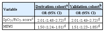 In the derivation cohort, the areas under the receiver-operating characteristic (AUROC) curves were 0.81 for the MEWS (95% confidence interval [CI], 0.76 to 0.87) and 0.87 for the MEWS_SF score (95% CI, 0.87 to 0.92) for predicting ICU admission. The AUROC curves were 0.70 for the MEWS (95% CI, 0.63 to 0.77) and 0.76 for the MEWS_SF score (95% CI, 0.70 to 0.83) for predicting in-hospital mortality. In the validation cohort, the AUROC curves were 0.71 for the MEWS (95% CI, 0.66 to 0.77) and 0.83 for the MEWS_SF score (95% CI, 0.78 to 0.87) for predicting ICU admission. The AUROC curves were 0.64 for the MEWS (95% CI, 0.57 to 0.70) and 0.74 for the MEWS_SF score (95% CI, 0.69 to 0.80) for predicting in-hospital mortality.