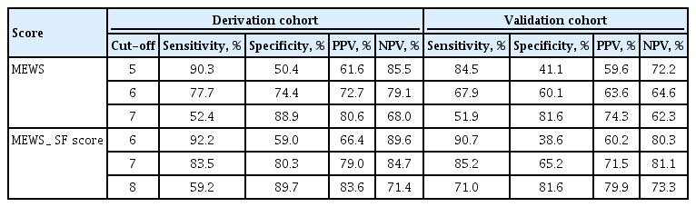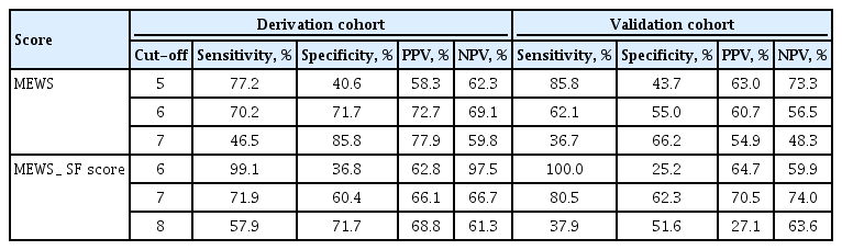 Next, the prediction power of the MEWS, SF score, and MEWS_SF score were reassessed in the validation cohort. Differences with a p value of < 0.05 were considered statistically significant. All analyses were performed using IBM SPSS software version 20.0 (IBM Corp., Armonk, NY, USA).
