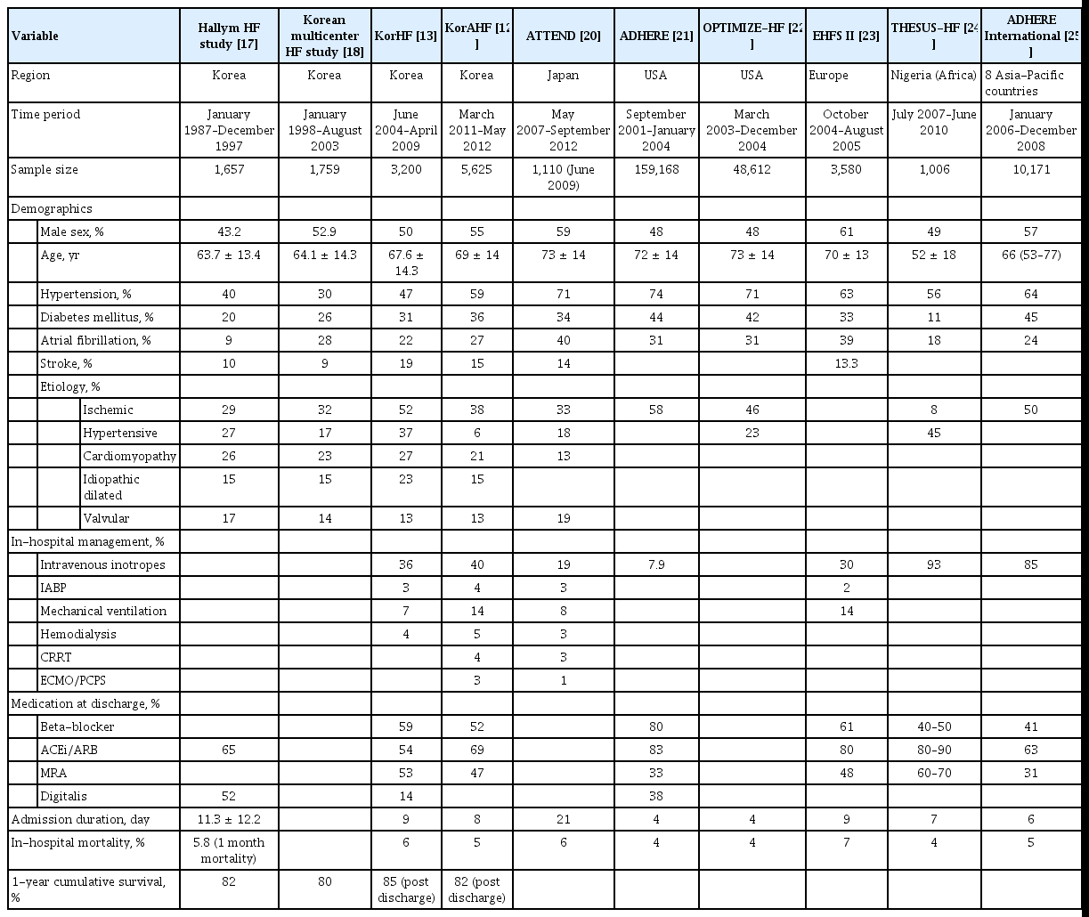 Regarding the post-discharge outcomes, the 1-year cumulative survival rate was 82%, 80.1%, 85%, and 81.8% for Hallym, Korea Multicenter, KorHF, and KorAHF, respectively. It is of note that direct comparison of the post-discharge outcomes is difficult because KorAHF validated survival using the National Insurance data or National Death Records mortality data, while the mortality was not validated in other registries, leaving the possibility of underestimation of the mortality rate. Taken together, the improvement in acute clinical care may have led to improved in-hospital outcomes, whereas long-term mortality remains unaffected.