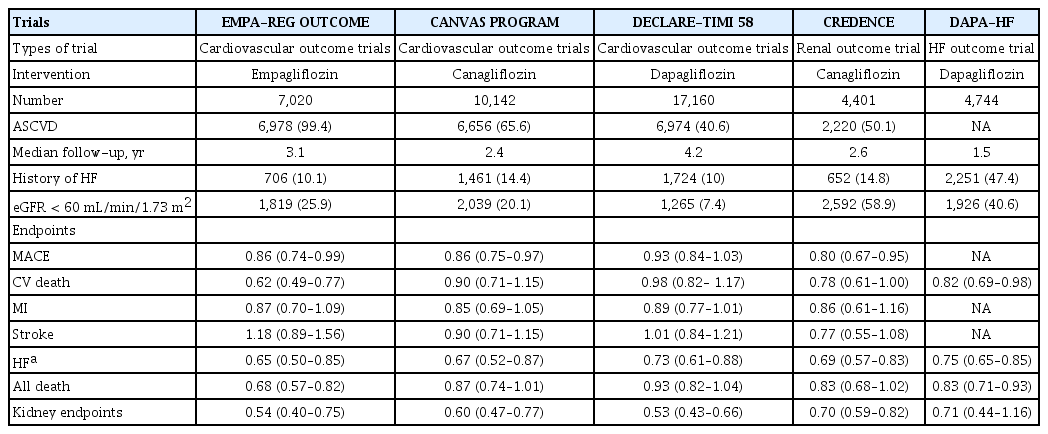 Because of the potential risk of adverse cardiovascular outcomes of antidiabetic drugs, they are required to undergo cardiovascular outcome trials to prove their safety. Sodium-glucose transporter 2 (SGLT2) inhibitors are a new class of oral antidiabetic drugs. In cardiovascular outcome trials (Table 2), empagliflozin [42], canagliflozin [43], and dapagliflozin [44] showed a robust reduction in hospitalization for HF in patients with type 2 diabetes mellitus with and without established atherosclerotic cardiovascular disease (ASCVD) [45]. This benefit was observed in a broad population regardless of prior HF, established ASCVD, ejection fraction, or kidney function [46].