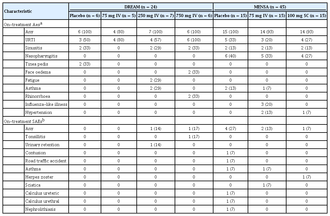 The most frequently reported on-treatment AEs in Korean patients across all treatment groups were upper respiratory tract infection (DREAM and MENSA), nasopharyngitis (MENSA) and sinusitis (DREAM [excluding the 75 mg IV group], and MENSA) (Table 2). The incidence of reported on-treatment SAEs in Korean patients was low across both studies, with four patients reporting an SAE in MENSA placebo, two in MENSA 75 mg, and one each in DREAM 250 mg, 750 mg and MENSA 100 mg groups (Table 2). One fatality across the two studies was reported, which was a Korean patient receiving placebo in the MENSA study. Overall, no anti-drug antibodies were detected in Korean patients at week 0 or at any time post-baseline. For both the DREAM and MENSA studies, no neutralising antibodies were detected in Korean patients during the treatment period.