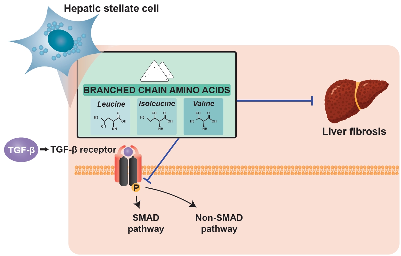 This study has some limitations. We focused on investigating the mechanism of BCAA effect on HSC activation and used the human HSC cell line LX-2, widely used in culture-based studies for hepatic fibrosis. However, it is not enough to explain the effect of BCAA on HSC based only on the results from LX-2 cells. Second, this study identified decreased expression of phosphorylation of Smad2 proteins and p38 after BCAA treatment in the TGF-β signaling pathway in HSC, but we did not identify expression of other genes involved in different stages of Smad and Smad-independent pathways. Because of this, it was not possible to determine the specific steps that are inhibited by BCAAs in the TGF-β signaling pathway. Further study is needed to elucidate the precise mechanism of BCAAs in the process of hepatic fibrosis, which will also advance future research into development of anti-fibrotic therapies.