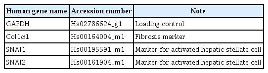 Total RNA was extracted using Trizol reagent (Thermo Fisher Scientific, Basingstoke, UK), and 1 μg of total RNA was reverse transcribed using the QuantiTect Reverse Transcription Kit (Qiagen, Hilden, Germany). Real-time quantitative polymerase chain reaction (PCR) was performed using a Light Cyclr 480 II (Roche Diagnostics, Mannheim, Germany) with the Light Cycle 480 Probes Master Reaction Mix (Roche). PCR reactions were performed with the TaqMan Gene Expression Assay (Applied Biosystems, Foster City, CA, USA). The levels of target gene mRNA transcripts relative to control glyceraldehyde 3-phosphate dehydrogenase (GAPDH) were determined by 2–ΔΔCt. PCR amplifications were performed at 95°C for 15 seconds and subjected to 55 cycles of 95°C for 10 seconds, 60°C for 30 seconds, and 72°C for 1 second. The following TaqMan probes were used: Col1α1, SNAI1, SNAI2, and GAPDH (Table 2). Semi-quantitative reverse transcription-PCR amplifications were performed for TIMP1 and TIMP2 at 94°C for 5 minutes and subjected to 23 to 36 cycles of 94°C for 30 seconds, 56°C to 60°C for 30 seconds, 72°C for 1 minute, and a final extension for 5 minutes at 72°C. The primer sequences were as follows (5′ → 3′): TIMP1, 5′–AGACCTACACTGTTGGCTGTGAG–3′ and 5′–GACTGGAAGCCCTTTTCAGAG–3′; TIMP2, 5′–ATGCACATCACCCTCTGTGA–3′ and 5′–CTCTGTGACCCAGTCCATCC–3′; GAPDH, 5′–GAGTCAACGGATTTGGTCGT–3′ and 5′–TTGATTTTGGAGGGATCTCG–3′.