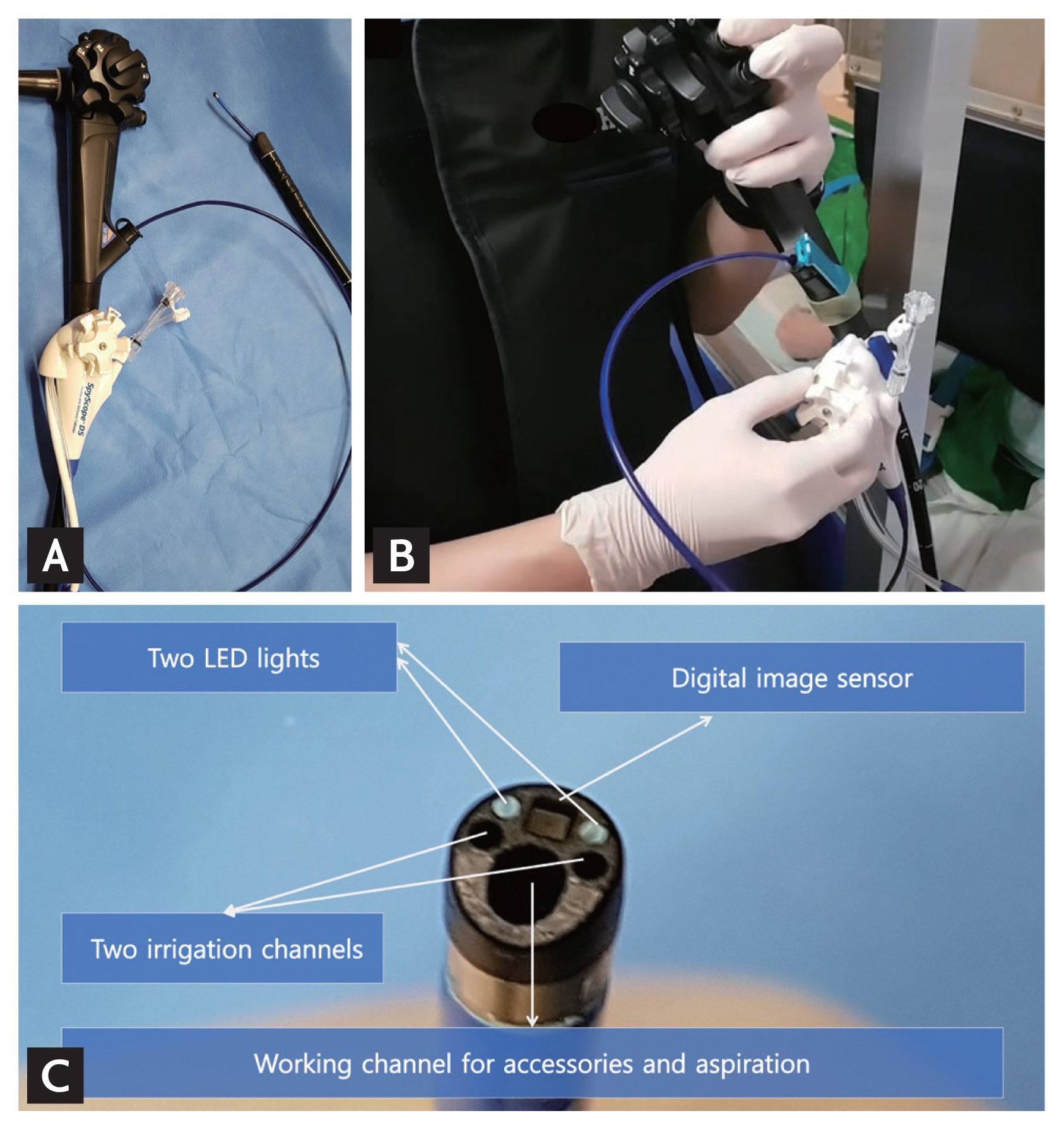 SOC, through the introduction of the SpyGlass DS Direct Visualization System (Boston Scientific, Marlborough, MA, USA), has led to a rapid increase in the use of cholangioscopy (cholangioscopy using the SpyGlass system is usually referred to as SOC). SpyGlass is a digital and single-use cholangioscope that overcomes several limitations of other types of cholangioscopes. Because this digital cholangioscope has a diameter of approximately 3.5 mm, it can be used to access the bile duct directly through the working channel of a duodenoscope. Because it is a ‘plug-and-play’ device, it is easy and quick to set up. This cholangioscope has both a 1.2 mm accessory channel and a 1.2 mm suction channel. Through the thin accessory channel, instruments, such as an EHL or LL probe, can be inserted and used for lithotripsy (Fig. 1).