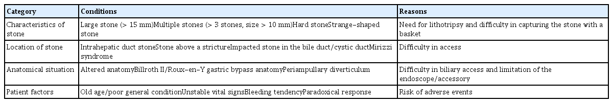No clear consensus exists about the definition of difficult BDSs. Factors that contribute to the difficulty in removing BDSs can be divided into four major categories: (1) stone characteristics, such as stone size > 15 mm, multiple stones, hard stones, and strange shape of stones (e.g., barrel shape); (2) stone location, such as in the intrahepatic duct (IHD), above a stricture, or impacted in the bile duct/cystic duct; (3) anatomical alterations that make access to the papilla challenging, such as the presence of a periampullary diverticulum, Roux-en-Y gastric bypass anatomy, and Billroth II anatomy; and (4) patient factors, such as bleeding tendency due to the use of an antithrombotic agent, age > 65 years, and unstable vital signs (Table 1).