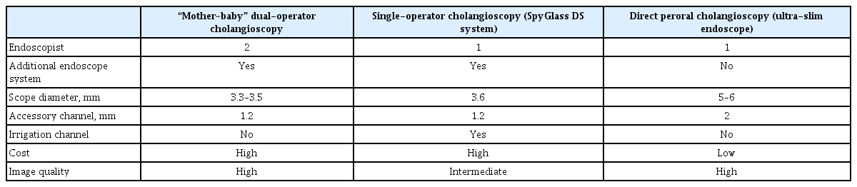Cholangioscopy is useful in the diagnosis and treatment of bile duct abnormalities, and was developed to overcome the limitations of ERCP. Three types of peroral cholangioscopy (POC) are currently available (Table 2) [20,21]: