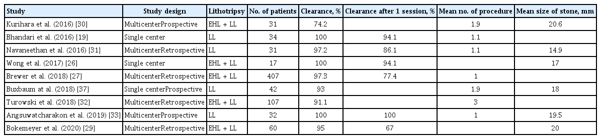In a meta-analysis of 49 studies, the overall stone clearance rate was 88% (95% confidence interval [CI], 85% to 91%) [28]. However, this study investigated all types of cholangioscopy-guided lithotripsy, including SOC-guided lithotripsy. Recent studies focusing on SOC-guided lithotripsy have reported better efficacy (Table 3) [19,26,27,29–34].