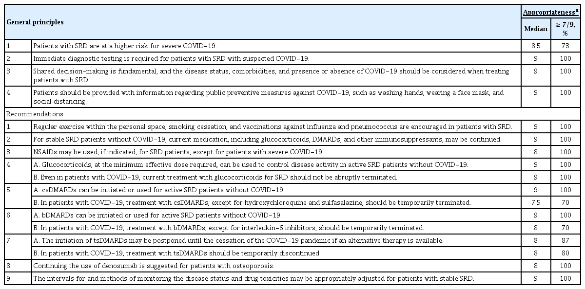 The recommendations were developed for the management of adult patients with SRD during the COVID-19 pandemic. Provision of recommendations for the treatment of COVID-19 was beyond our study scope. SRD refer to autoimmune or immune-mediated rheumatic diseases, including RA, SLE, spondyloarthritis, and other such diseases. The recommendations were intended for rheumatologists and other physicians who manage patients with SRD. The health questions for developing the recommendations included general principles, preventive measures against COVID-19, treatment of stable or active SRD patients without COVID-19, treatment of SRD patients with COVID-19, and assessment and monitoring of SRD. The medications used for patients with SRD were classified, as follows: (1) nonsteroidal anti-inflammatory drugs (NSAIDs), (2) glucocorticoids, (3) conventional synthetic disease-modifying antirheumatic drugs (csDMARDs), (4) biological DMARDs (bDMARDs), (5) targeted synthetic DMARDs (tsDMARDs), and (6) denosumab.