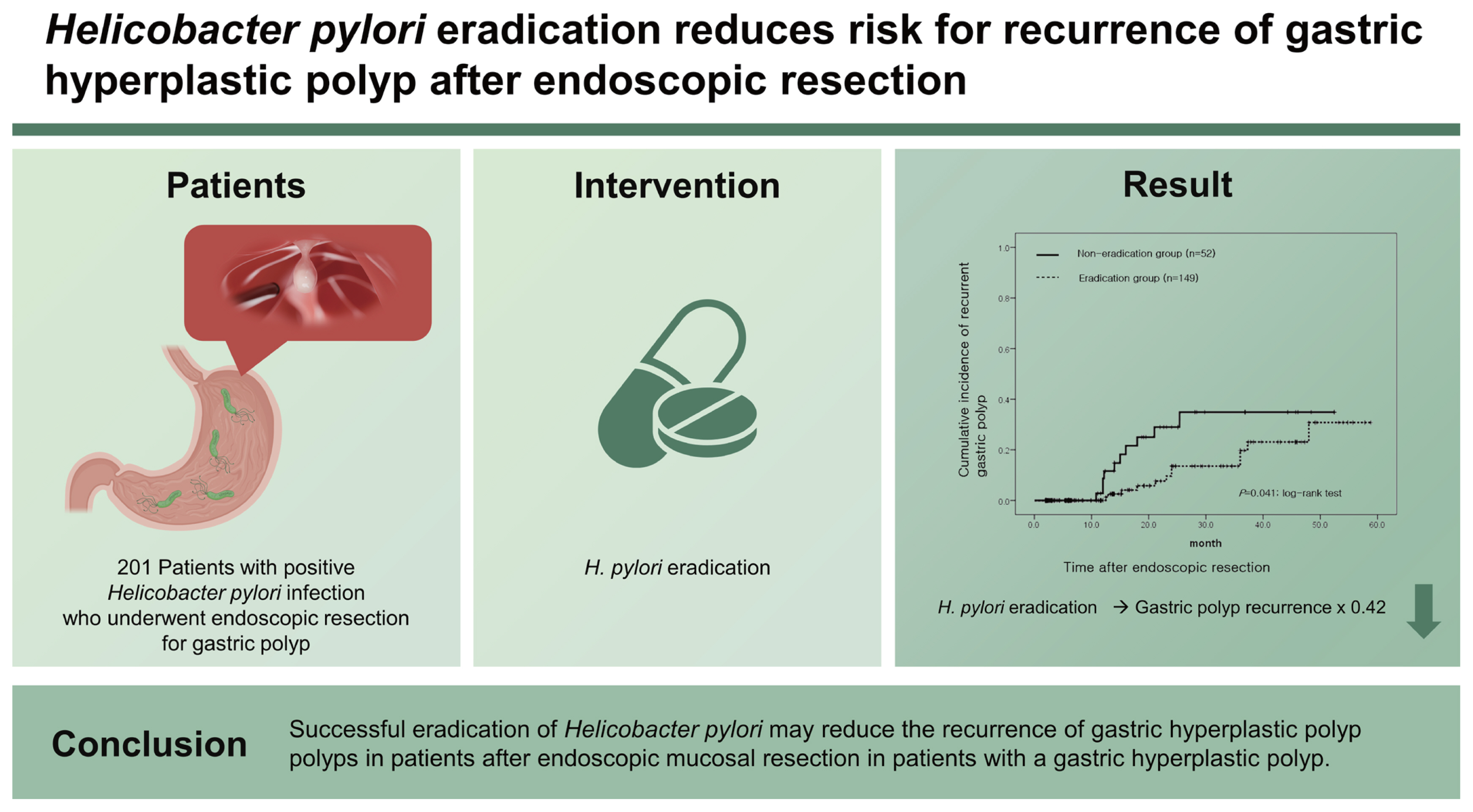 2. H. pylori eradication reduced the recurrence of gastric hyperplastic polyps after endoscopic resection.