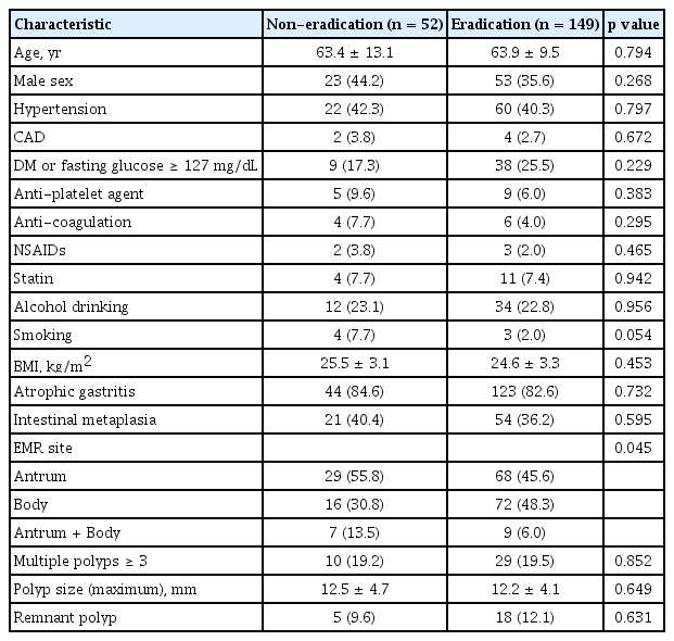 Between 2011 and 2018, the records of 380 patients who underwent endoscopic resection for gastric hyperplastic polyps were analyzed. Among the 380 patients, 143 had negative H. pylori test results, 28 did not undergo follow-up endoscopy, and 8 were not followed up after eradication treatment. These patients were subsequently excluded. Of the 201 patients included in the final analysis, 158 received H. pylori eradication therapy and 149 had successful eradications. Of the nine unsuccessful H. pylori eradications, four underwent bismuth-based quadruple therapy. Hence, 149 and 52 patients were classified into the eradication and non-eradication groups, respectively (Fig. 1). The mean age of the two groups was 63.4 ± 13.1 years in the non-eradication group and 63.9 ± 9.5 years in the eradication group (p = 0.79). There were no statistical differences between the two groups in terms of sex, diabetes, antiplatelet and anticoagulant use, smoking, or alcohol consumption (Table 1).