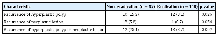 We retrospectively reviewed the medical records of 201 patients with H. pylori infection who underwent endoscopic resection for gastric hyperplastic polyps at six medical centers. H. pylori status was assessed by histological analysis and a rapid urease test. A total of 149 patients underwent successful H. pylori eradication (eradication group), whereas 52 patients had persistent H. pylori infections (non-eradication group). The recurrence rate of gastric hyperplastic polyps and the risk factors according to H. pylori status were analyzed.