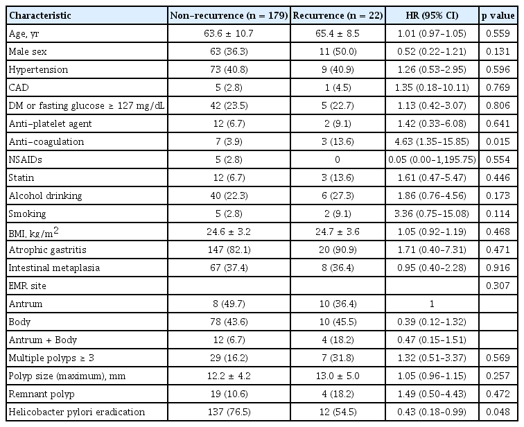 Comparison of clinical and endoscopic characteristics according to the recurrence of gastric hyperplastic polyps