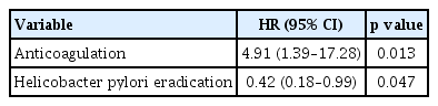 The demographic and endoscopic factors affecting the recurrence of gastric polyps were analyzed (Table 3). Multivariate analysis was performed using Cox regression analysis on the results of the univariate analysis and variables that may have had clinical significance (including age, sex, past medication history, and H. pylori eradication). As a result, multivariate analysis confirmed that both H. pylori eradication (HR, 0.42; 95% CI, 0.18 to 0.99) and anticoagulation (HR, 4.91; 95% CI, 1.39 to 17.28) affect the recurrence rate of hyperplastic gastric polyps (Table 4).