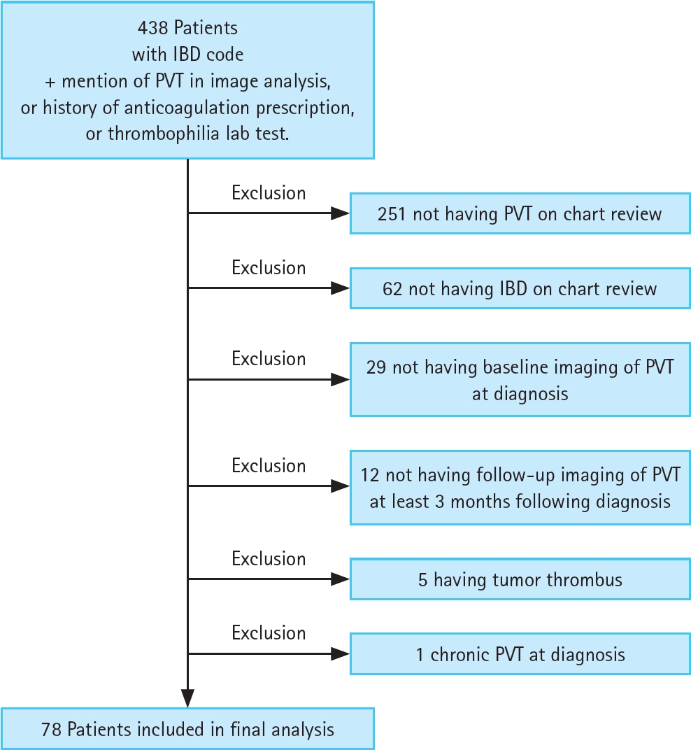 Between June 1, 1989 and December 15, 2021, we retrospectively reviewed patient records at Asan Medical Center in South Korea. We identified individuals aged 18 years and older diagnosed with IBD. Inclusion criteria were based on mentions of PVT in imaging reports, prescription of anticoagulants, or evidence from thrombophilia tests. Patient eligibility was verified via electronic health records.