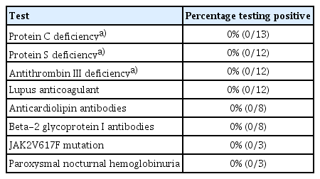 PVT diagnoses were confirmed exclusively through CT imaging, which helped in excluding chronic PVT cases characterized by specific radiographic features such as cavernous transformation. The predominant occurrence of PVT was in the left or right PV, accounting for 94.9% of cases. Notably, all diagnoses were incidental. Thrombophilia evaluations were conducted in 17.9% of patients, revealing no cases of primary thrombophilia. The results of thrombophilia testing can be found in Table 2.