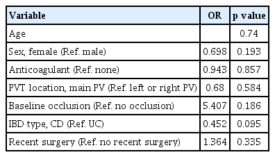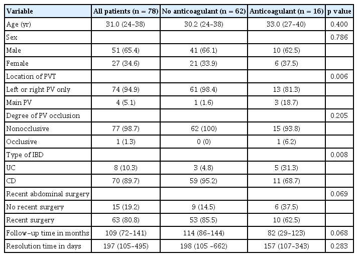 1. This study analyzed the characteristics and prognosis of concurrent PVT in South Korean IBD patients and is of significance due to the favorable outcomes observed regardless of anticoagulation use.