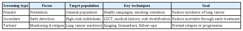 Lung cancer screening is a multi-tiered approach aimed at reducing mortality through prevention, early detection, and disease management, with low-dose computed tomography (LDCT) being the primary recommended screening tool for high-risk individuals (Table 1). Primary screening (prevention-focused) aims to reduce the risk of developing lung cancer through lifestyle modifications and environmental interventions. Secondary screening (early detection) primarily involves the use of LDCT to detect cancer at an early stage, before symptoms appear. Tertiary screening (monitoring and relapse prevention) focuses on managing diagnosed cases to prevent complications and improve quality of life.