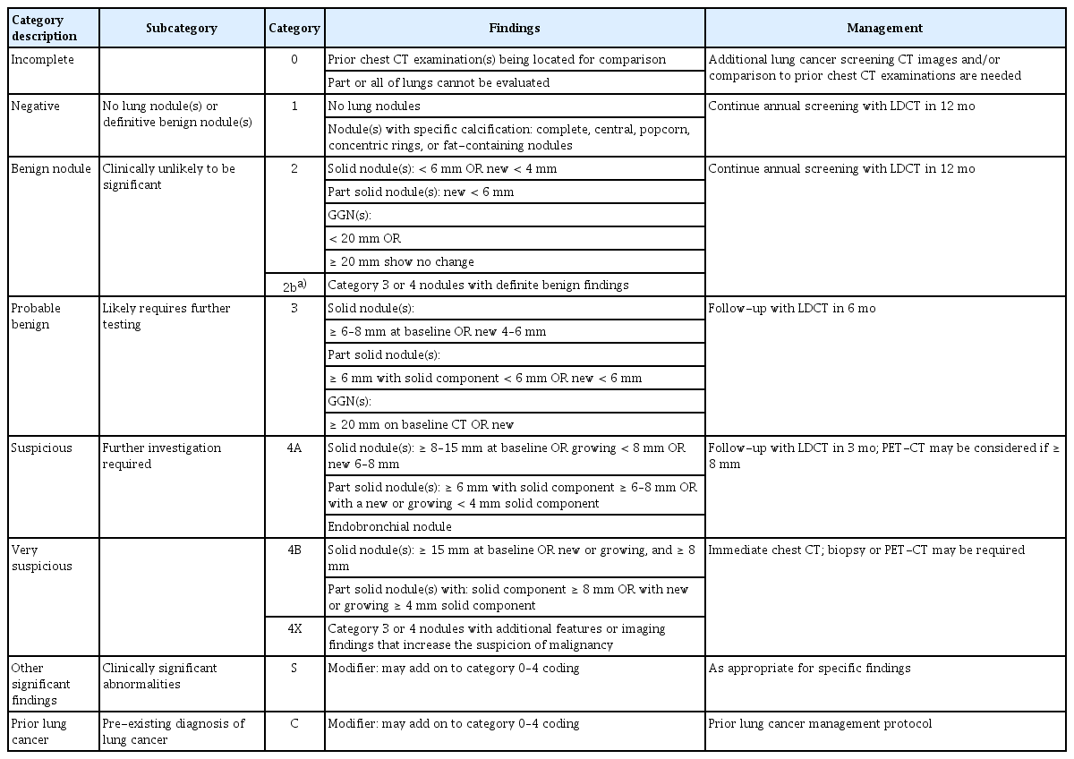 To evaluate the feasibility of implementing a national lung cancer screening program, a pilot project was conducted from 2017 to 2018 [7]. Key screening results are summarized in Table 2. A single LDCT scan was performed on 13,692 individuals nationwide. The average age, smoking history, and proportion of current smokers among the participants were similar to those observed in the NLST. Detected lung nodules were assessed using the Lung Imaging Reporting and Data System (Lung-RADS) version 1.0, a classification system proposed by the American College of Radiology. Although this classification differed from that used in the NLST, a reanalysis of NLST data using Lung- RADS yielded very similar results in terms of positive screening rates, false-positive rates, lung cancer detection rates, and early-stage lung cancer incidence rates. The National Lung Cancer Screening Program (NLCSP) in Korea adopted a modified version of Lung-RADS version 1.0, incorporating adjustments to better reflect the unique epidemiological and clinical characteristics of the Korean population (Table 3).