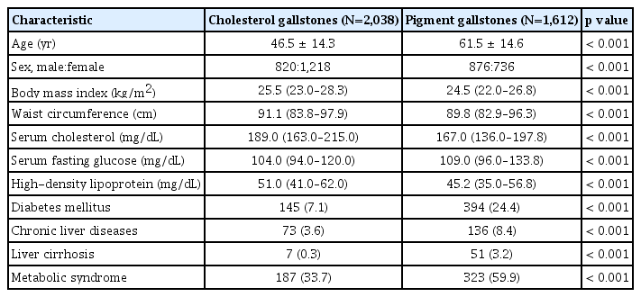 Of the 3,650 patients, 2,038 (55.8%) had cholesterol gallstones and the remaining 1,612 (44.2%) had pigment gallstones. Patients in the cholesterol gallstone group were younger than those in the pigment gallstone group, with mean age of 46.5 years and 61.5 years, respectively (p < 0.001). Gallstones were slightly more common in female than in male (53.5% vs 46.5%); however, cholesterol gallstones were more prevalent in female than pigment gallstones (62.3% vs 37.7%, p < 0.001). Chronic liver disease, including liver cirrhosis and chronic hepatitis B and C, was significantly more prevalent in the pigment gallstone group than in the cholesterol gallstone group (p < 0.001). Patients in the cholesterol gallstone group had a significantly higher median BMI (median 25.5 kg/m2 vs. 24.5 kg/m2, p < 0.001), waist circumference (91.1 cm vs. 89.8 cm, p < 0.001) and serum cholesterol level (median 189.0 mg/dL vs. 167.0 mg/dL, p < 0.001) than those of patients in the pigment gallstone group.