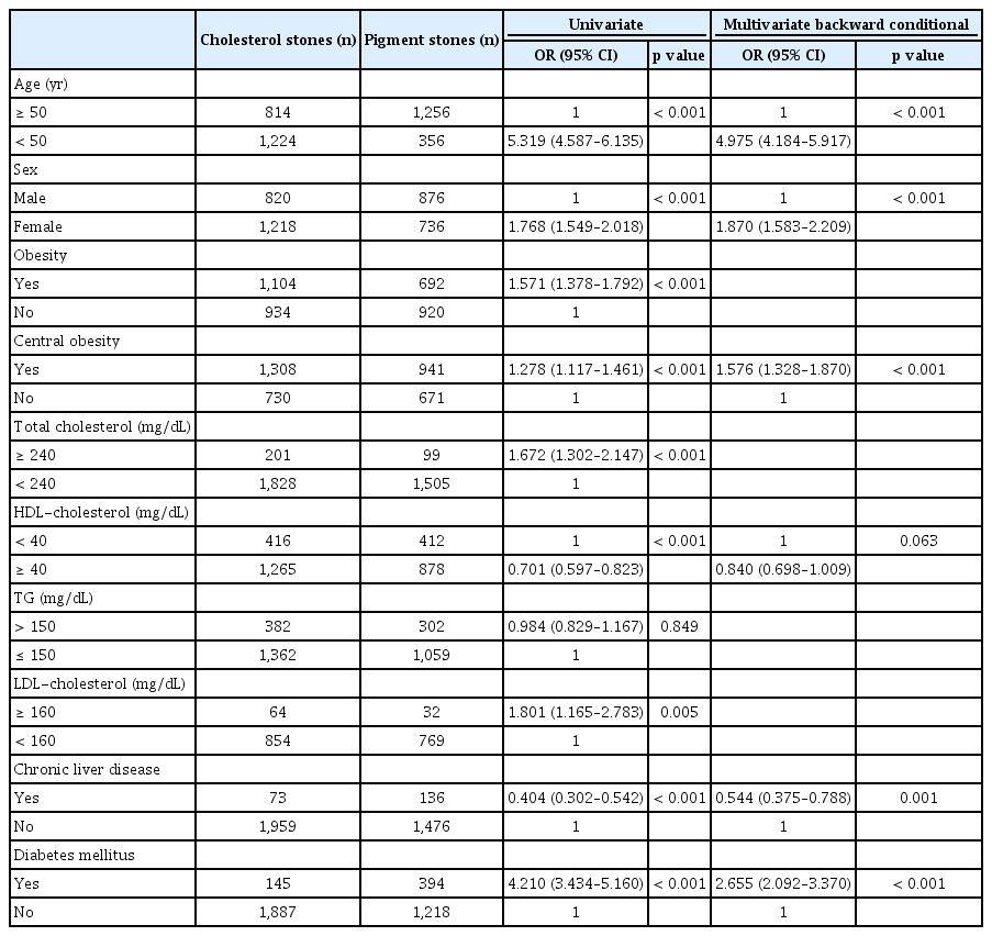 After the exclusion of 259 patients with mixed type gallstones, 3,650 patients were finally included in this study; 2,038 (55.8%) with cholesterol gallstones and 1,612 (44.2%) with pigment gallstones. The proportion of cholesterol gallstones over the 14-year period was 53.8% of the study population as a whole and 77.5% of individuals aged < 50 years. The multivariate analysis revealed that cholesterol gallstones were associated with an age < 50 years, female sex, central obesity, absence of chronic liver diseases, and diabetes mellitus. High density lipoprotein-cholesterol levels showed a tendency toward an association with cholesterol gallstones.