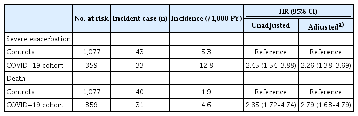 As shown in Table 2, during a mean follow-up of 7.4 (standard deviation [SD] 3.1) months including a 30-day lag period, the incidence rate of severe exacerbation was higher in the COVID-19 cohort than in controls (12.8/1,000 person-years vs. 5.3/1,000 person-years, p < 0.01). Even after adjusting for potential confounders, individuals in the COVID-19 cohort had a higher risk of severe exacerbation (adjusted hazard ratio [aHR] 2.26, 95% confidence interval [CI] 1.38–3.69) compared to controls.